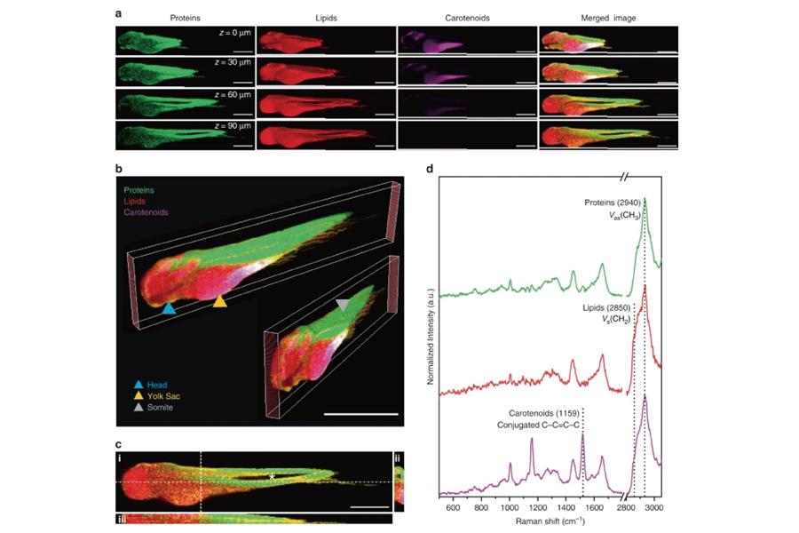 在這個文獻中,作者就利用了三維的拉曼擷取來驗證斑馬魚的胚胎上的ΔRD1基因突變造成的膜破壞。達到一個非染色且有時間變化的分子鑑別的生醫影像