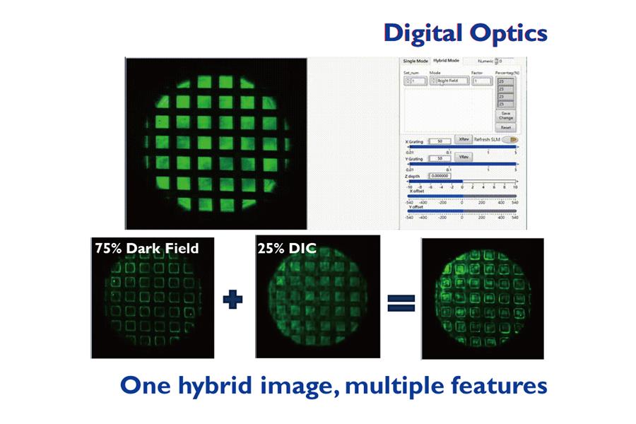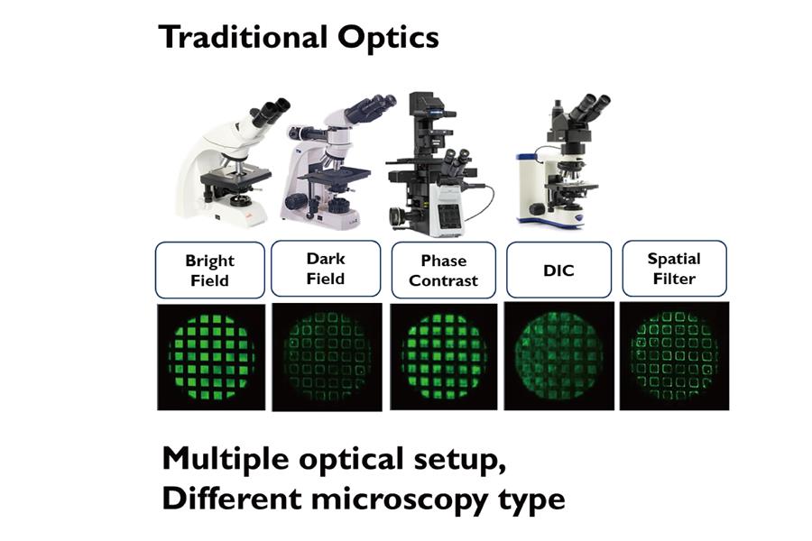 在傅立叶显微镜(术)的应用上,搭配数字光学的技术,可以在同一台显微镜下同时取得亮视野(Bright-field) 、暗视野(Dark-field)、相位差(Phase Contrast)、干涉相位差(Differential Interference Contrast, DIC)等功能,无须再添购其他模块,一机多用的显微影像撷取和分析功能。